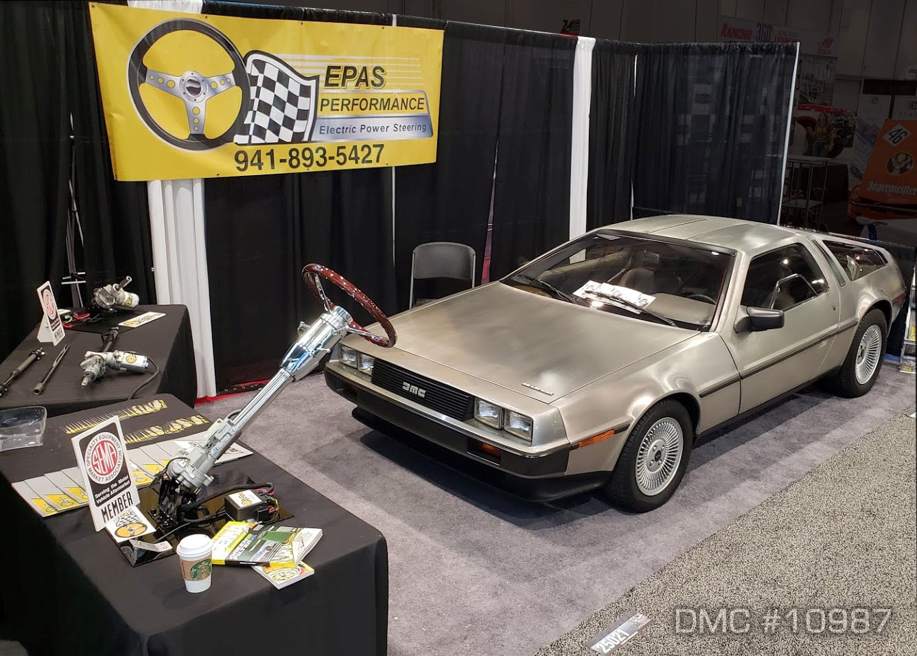 VIN 10987 was invited to demo the installation of the Electric Power Steering system at the 2018 SEMA, Las Vegas show over the last week of October. Having just completed the 665 mile round trip drive from San Diego to Las Vegas for the DeLorean Weekend, driving there a second time in one month made for an easy comparison. Whether driving at highway speeds or navigating city streets, it is a true pleasure to drive our DeLorean now! Wiggling the DeLorean through the maze of narrow aisles in the SEMA building… my 3 handlers were nervous the whole trip, but it was a piece-of-cake for me at the steering wheel!